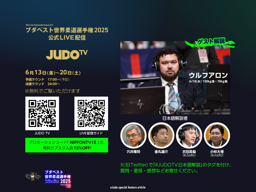 質問・意見・感想など募集。X(旧Twitter)にてハッシュタグ「#JUDOTV日本語解説」をつけて投稿してください。LIVE中継中に紹介させていただきます。質問の狙い目は、強豪の登場間隔が空く予選ラウンド。たくさんの投稿お待ちしています。