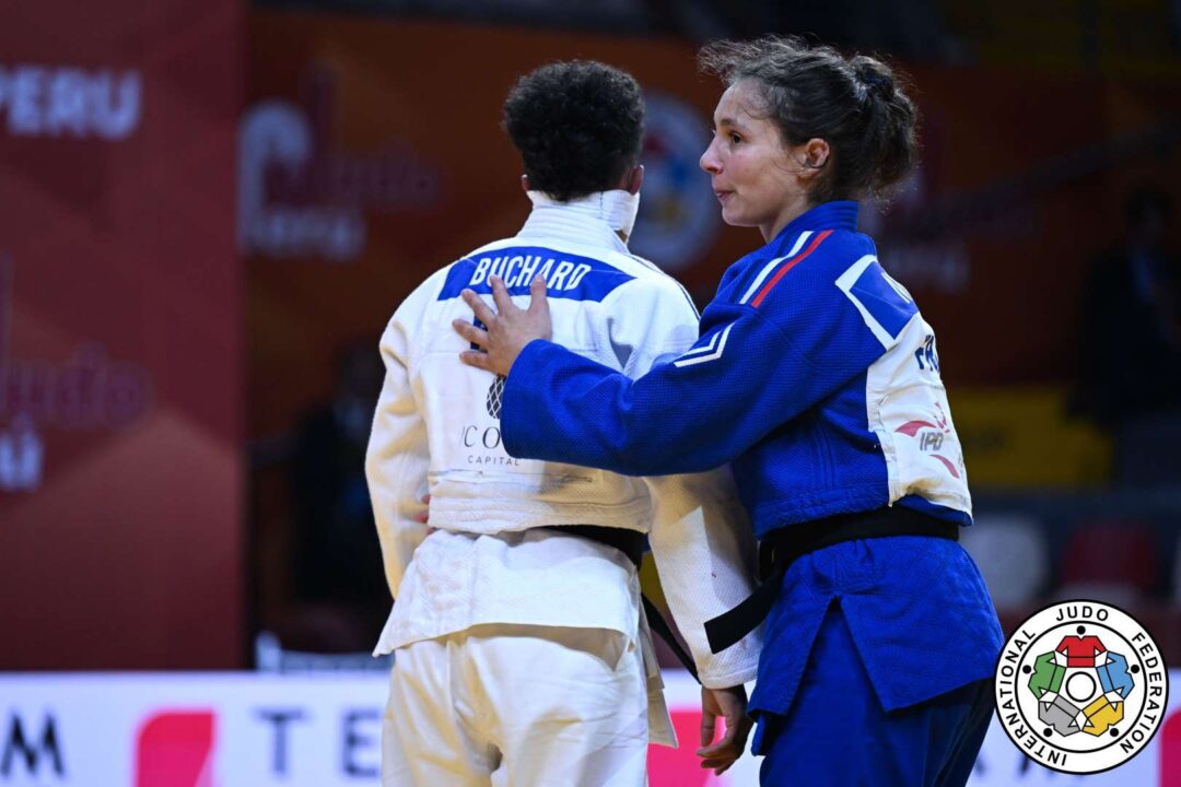 57kg級決勝はフランス対決。52kg級から突如階級を上げてエントリーした東京五輪銀メダリスト、アモンディーヌ・ブシャーと57kg級で次代のエースと期待されるファイザ・モクダの強豪2人が、期待通りに相まみえることとなった。