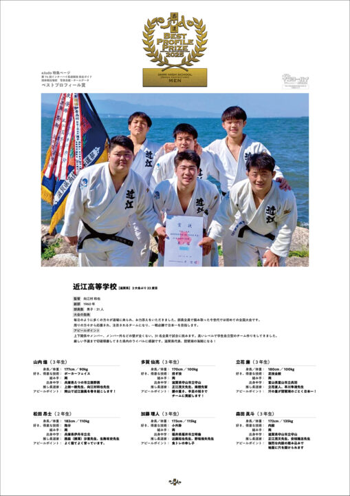 この度は、近江高校柔道部の応援ありがとうございました。団体戦の結果は悔しい結果で終わりましたが、このようにベストプロフィール賞を受賞できて大変嬉しく思っています。