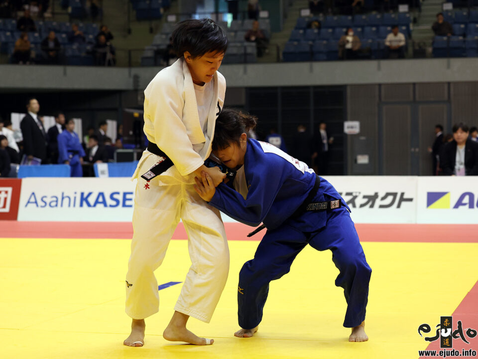 トーナメントの出だしは波乱含み。第1シードの近藤美月(東海大3年)が欠場。そして、全日本学生体重別選手権を獲って復活基調に乗ったと思われていたV候補・宮木果乃(日本大3年)が早々に姿を消した。1回戦は朝田結衣(近畿大3年)からGS延長戦1分49秒左背負投から逆側に抜け落として得た「有効」で勝利も、2回戦で畑山凜(明治国際医療大2年)に苦杯。ケンカ四つの相手を圧し、左体落動作で振り、膝を着かせ、ぶらさがる相手を引きずり、それでも立たないとみるや腹を出し、相手の頭を腰にくっつけたまま前に出て圧したが、ここに落とし穴。膝を着いたまま次第に頭を上げた相手がこの前進に合わせて右一本背負投。「寝から立ち」の間隙を突いたこの技は「有効」となる。以後は猛攻も、偽装攻撃の「指導」1つを押し付けたのみで4分間が終わってしまった。