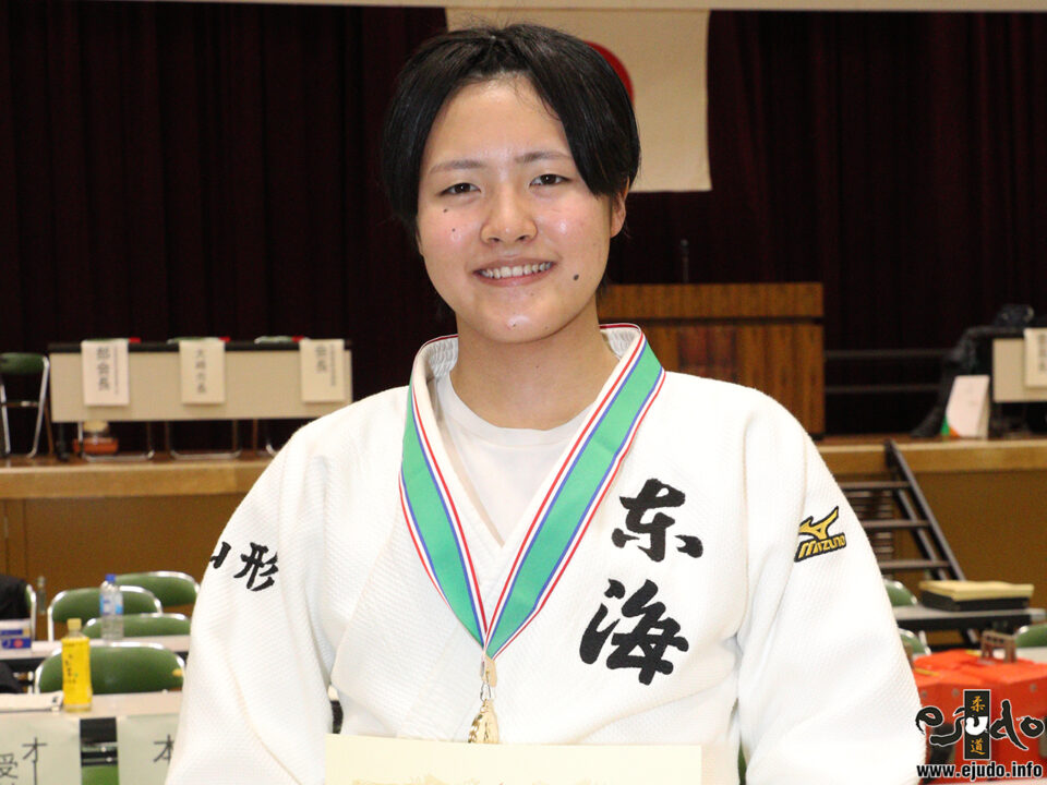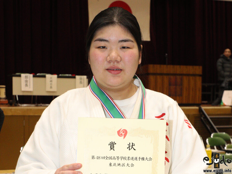 「柔道は高校生になってから始めました。得意技は大外刈です。(ー今後の目標は?)また勝てるように頑張ります。」
