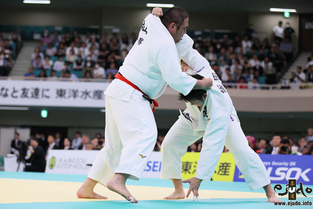 ともに右組みの相四つ。鈴木は身長180センチ体重120キロ、阿部は167センチ66キロ、これぞ無差別という体格差。阿部は「釣り手で袖」を一手目に据え、この手立てで「引き手で襟」を掴んでくる鈴木の組み手の先を行く。引き手で軸を作ることに時間が掛かる鈴木は苦慮。持ち直し、釣り手で上から圧を掛けるが、阿部は鈴木のクロス組み手を足取りの右大内刈で切り返し、腹ばいに伏せさせて会場を沸かせる。以後も釣り手を袖に絡ませては相手の前進を減殺。足持ちの右大内刈、相手の支釣込足を切り返しての朽木倒と繰り出して明らかに攻勢。対する鈴木は攻勢点の不利を意識したか残り2分から敢えて組み手を粗い方向に振り、過程を飛ばした二本持ちで圧力。クロスの大外刈に相手の腕を両手で抱え込んでの時計回り浮落と攻勢に出る。残り1分1秒に、阿部の指の止血で試合が中断。「はじめ」が掛かると阿部は圧を潜り抜け、釣り手で奥襟を叩いて重心低く大内刈。しかし待ち構えた鈴木抱き込んで正面に弾き返し、もろとも畳に埋めて「一本」。阿部は大魚を逸したが、見ごたえある試合に場内は万雷の拍手。(当日戦評・eJudo)