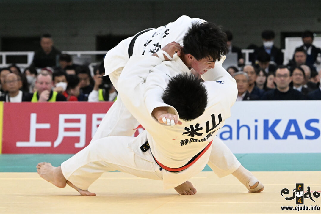 中村が右、米山が左組みのケンカ四つ。釣り手を上から奥襟に入れて圧力を掛けたい中村に対し、下から釣り手で前襟を確保し、前進して間合いを詰めたい米山という構図で試合が進む。中村は遠間から右大外刈、股中の右体落、一方の米山が前進圧力を掛けての左小外刈と、互いに動き良く攻め合う。体は動くが展開は膠着、という形のまま迎えた残り30秒、米山が組み際に体を捨てての左小外掛で勝負に出る。しかしこの「際(きわ)」こそ中村の生息域。バランスよく躱して浴びせ返し、背中を畳に押し付ける。これが「一本」となり、試合は決着となった。(当日戦評・eJudo)