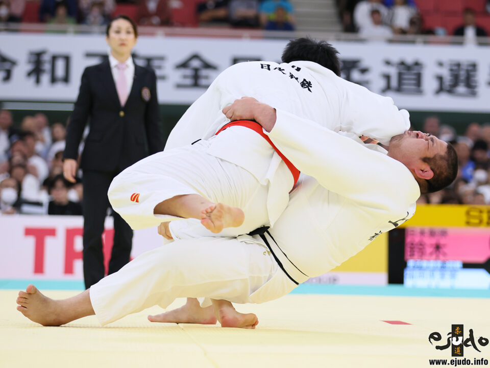 西森 体格差のある対戦も面白いですが、重量級同士がっぷり、肉弾相打つ戦いも全日本選手権の魅力。かつての上川大樹選手対石井竜太選手であったりとか、上川大樹選手対西潟健太選手とか、全日本にはこういう系譜もあります。ベテラン上林山選手と若手の鈴木選手が繰り広げる、この「系譜」に連なる一番。興味深い試合でした。先に上林山選手に3つ目の「指導」が行ったことで鈴木選手がちょっとほっとしたというか、終わりを意識し始めたところであの裏投が出て、流れが変わってしまった。上林山選手はさすがでしたし、逆に鈴木選手としては少し若さというか、若いなりの勝負に対する甘さが出てしまったなと感じた試合でした。全体的に、清々しい試合だったなと思いました。