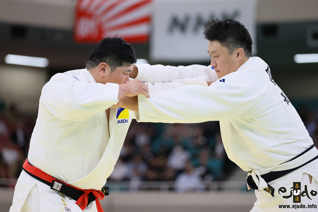 原沢が右、増山が左組みのケンカ四つ。組み止めたい原沢、動きの中で担ぎ技を狙いたい増山という構図。原沢は煽り出しをベースに試合を組み立てる。増山は片手の左背負投を度々仕掛けるも、原沢の懐の深さと「被せる釣り手」を前に空回り。十分に効かせられない。1分4秒、増山の左小外掛を原沢が弾き返し、左小外掛に繋いで大きく崩し、あわやポイントかという場面を作る。2分38秒にも右内股で跳ね上げ、増山は腹ばい。攻勢点は明らかに原沢。増山もはや投げるしか逆転はありえないと特攻、残り30秒に思い切って左背負投に飛び込むが、状況優位の原沢はこれが良く見えている。裏投で返して腹ばいに落とし「待て」、印象点がさらに積み上った格好。増山は最後の勝負とばかりに片手の左背負投も、原沢待ち構えて抱き止め、谷落に切り返す。今度は逃さず背中から畳に埋め、4分53秒「一本」。(当日戦評・eJudo)